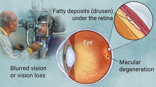 Age-related macular degeneration (AMD) is the most common cause of irreversible central vision loss in older patients. Dilated funduscopic findings are diagnostic; color photographs, fluorescein angiography, and optical coherence tomography assist in confirming the diagnosis and in directing treatment. Treatment is with dietary supplements, intravitreal injection of antivascular endothelial growth factor drugs, laser photocoagulation, photodynamic therapy, and low-vision devices.